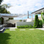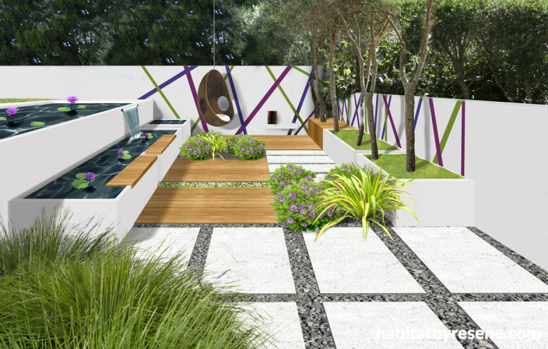 The same area is given a concept by Grant Stephens and Rebecca Hammond of H&S Landscape Design. This fun scheme features walls with bold lines of Resene Belladonna, Resene Sushi and Resene Blue Gem on a base of Resene Athens Grey crossing each other and mimicking the different angles of the tree trunks in front. Vibrant purple water lilies are framed in a pond while channels of blue flowering pratia flow between decks finished in Resene Woodsman in Resene Natural. A hanging wicker egg seat at the back provides a comfortable spot to sit.