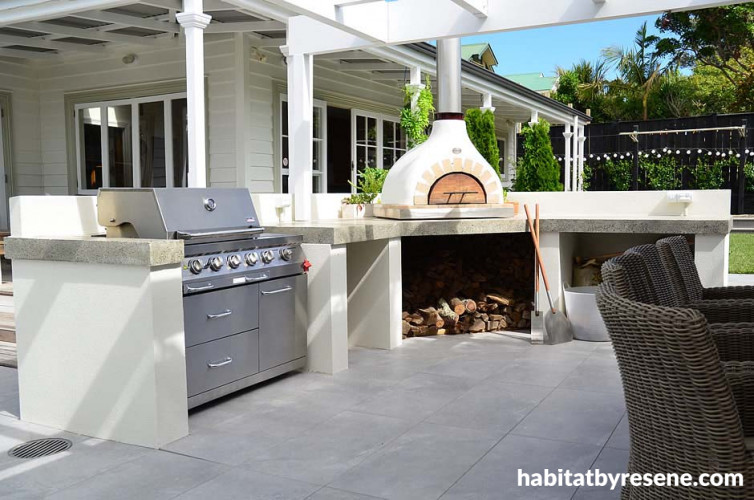 Demolishing the old garage at the rear of their section gave Chris and Sandra room to create their dream outdoor living space – a pergola dining space complete with a pizza oven. It’s been a hit with young and old alike, especially their teenage sons and their friends. The plastered block walls and pizza oven (from Authentic Ovens) are finished in Resene X-200 acrylic waterproofing membrane tinted to Resene Triple Rice Cake to complement the house’s Resene Triple Rice Cake weatherboards and Resene Tana trims.