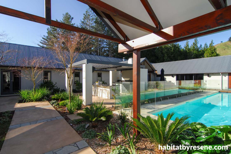 Steve and Annie Harrington wanted a “real showpiece” courtyard; an inviting, yet relatively easy-care, semi-tropical enclosed area. Charlotte Pedersen of Espaso Verde helped design the multi-purpose space which includes the entrance, a pool, a sitting area and a stunning outdoor kitchen. A palette of natural hues harmonises with the setting with house walls painted in Resene Ash and darker trims and doors in Resene Grey Friars. For more of this garden, see the latest issue of habitat.