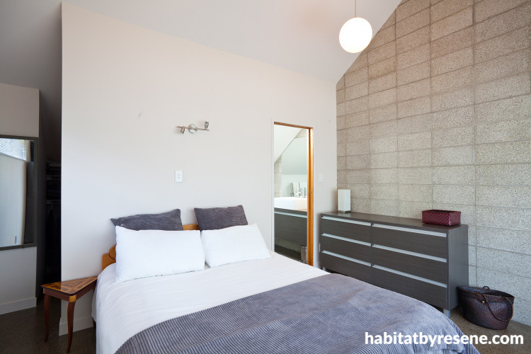 What colours did you use? Inside the house, we used Resene Blanc throughout. It is a very warm white that seems to work well in all the spaces. It also brings out the white specks in the concrete blocks. In the bathroom, we used Resene Black White; it is a very clean white that looks great in the bathroom. We also used it for all of the window frames. All of the internal doors are Resene Napa. For the house's exterior, we used Resene Sea Fog on the weatherboards and greeny-grey Resene Tapa at the front (where the bricks were plastered over). I’ve always loved the way that water changes colour depending on the weather, and this inspired me to choose Resene Tapa. For the fence, I wanted a contrasting colour to the grey of the concrete, so I chose Resene Bokara Grey, which is a very warm, deep browny-grey.