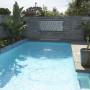 Shades of grey, blue and green continue in the garden outside, where the swimming pool is the central focus.