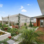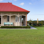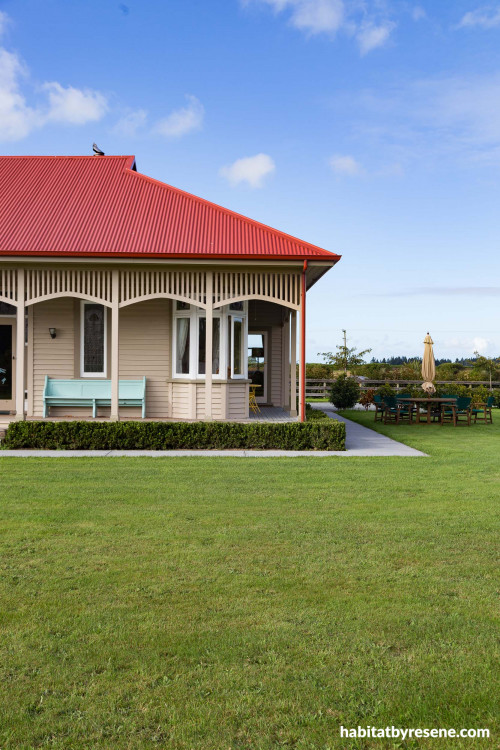 Artist Libby Chambers painted her Canterbury home in Resene Desert Sand with bench in Resene Mint Tulip to complement her existing bright red roof.