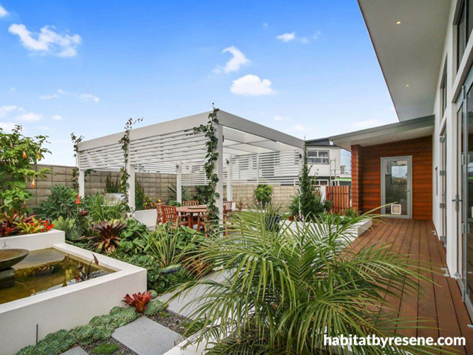 Homeowners Flint and Celia’s backyard was a top priority during the renovation of their Hawke’s Bay home. The pergola is painted Resene Double Black White and the furniture is stained with Resene Woodsman Whitewash. A selection of subtropical plants creates a striking contrast against the warm timber decking, which is stained with Resene Woodsman Heartwood.