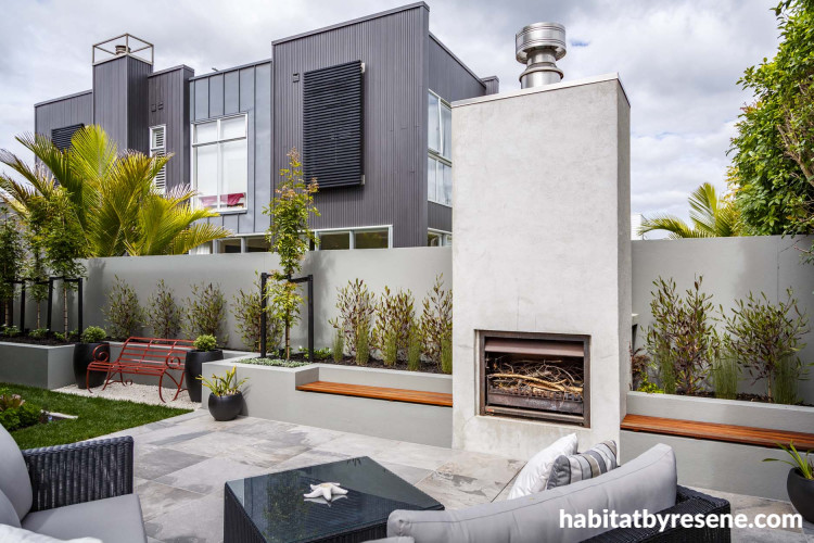 Homeowner Dave Lewis created a detailed yet calming outdoor area with raised planter beds and boundary fence in Resene Tapa. The Resene Tapa fence created a perfect backdrop for Dave’s colourful 100-year-old riveted bench seat in Resene Pioneer Red. Image by Bryce Carleton.