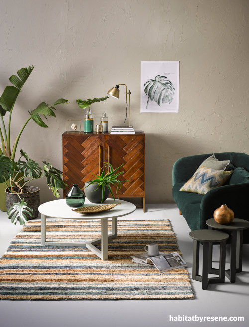 Resene Resitex Plastercote was used beneath two topcoats of Resene Double Ash to give this lounge a Mediterranean vibe. Floor in Resene Silver Chalice, coffee table in Resene Helix, nesting side tables in Resene Karaka, tall brass ring vase (with monstera leaf) in Resene Permanent green, short brass ring vase in Resene Helix, and plant pot (on table) in Resene Karaka. Console from Freedom Furniture, sofa from Me & My Trend, rug and cushions from Furtex, large basket from Indie Home Collective.