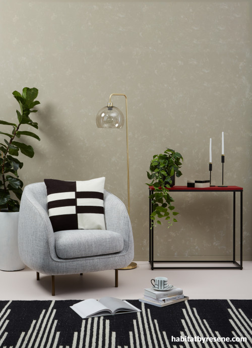 In this reading nook, the walls were first painted in Resene Napa before building up a number of light, thin layers of Resene Eighth Stonewashed by sponging the colour on with a clean rag. Floor in Resene Ethereal, console tabletop in Resene Dynamite, large plant pot in Resene Alabaster and small plant pot in Resene Noir. Chair and rug from Freedom Furniture, lamp from Kmart, cushion cover, mug, box and candlesticks from H&M Home.