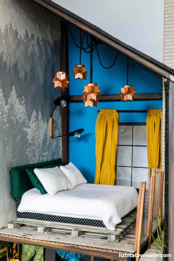 The master bedroom sports a whimsical feature wall in Resene Wallpaper Collection 5276-2 and a natural-look floor in Resene Wallpaper Collection 18291. The back wall is in Resene Discover with Resene Black joinery. The lights are in Resene FX Metallic Magma and wall light in Resene Black. The pallet bed base is in Resene Triple Bison Hide, Resene Half Arrowtown and Resene Black.