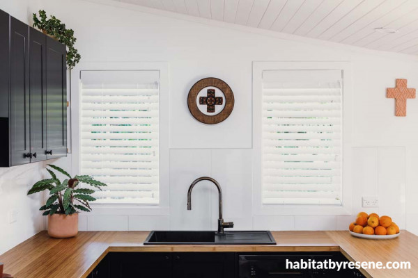 Resene SpaceCote Low Sheen Kitchen & Bathroom tinted to Resene Quarter Alabaster shines in the kitchen. “I went with a strong white colour scheme with my paint selection in order to have our black kitchen pop. It was a great combo,” says Alice. To replicate the black cabinetry look in your home, try Resene Black or Resene Nero.