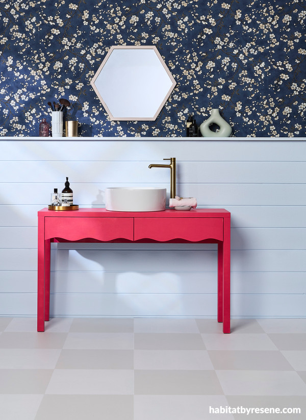 Pink reigns supreme as a go-to shade for injecting spaces with vibrancy and joy. In this luxe ensuite bathroom, Resene Drop Dead Gorgeous steals the show on the vanity and complements the surrounding cooler tones in Resene Pattens Blue and Resene Denzo II Wallpaper Collection 456738. The floor is painted in Resene Triple Black White and Resene Half Black White, mirror in Resene Contented and vase in Resene Lemon Grass. Project by Annick Larkin, image by Bryce Carleton.