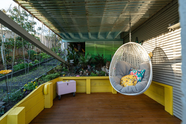 Homeowner Natalie went all out in her garden, adding joy and whimsy for her and her outdoorsy toddler. Behind the magical fairy garden, the green trellis is painted in a mix of Resene Crusoe, Resene Japanese Laurel, Resene Tree Frog, Resene Wham, Resene Groovy, Resene Snowy Mint and Resene Feijoa. The retaining wall also steals the show in the electric yellow of Resene Bright Spark. Image by Nick Beadle.