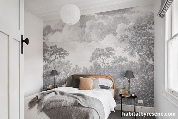 Resene Foggy Grey, a misty and contemporary hue, not only complemented the Resene Half Merino walls but also created a strong connection to the couple’s striking wallpaper choice for their master bedroom. The Wildscape NZ Wallpaper Mural was created for Resene by Peter’s sister, artist Tanya Wolfkamp. The forest design incorporates elements of engravings from Captain Cook’s third voyage to New Zealand in 1777, Italian intaglios and native bush such as toetoe and ponga.