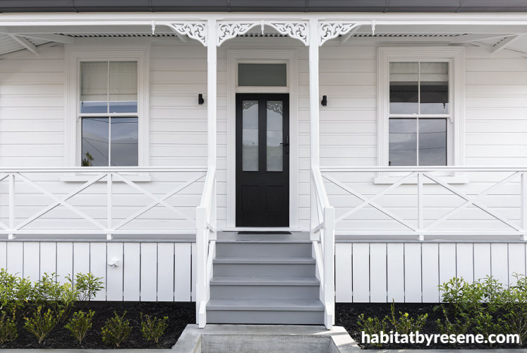 Beautiful in its simplicity, Peter and Debbie’s home featuresResene Sonyx 101 Black White walls with Resene Lustacryl Black White trim, Resene Walk-on Gunsmoke on the veranda and bold Resene CoolColour Nero on the front door.
