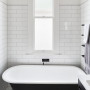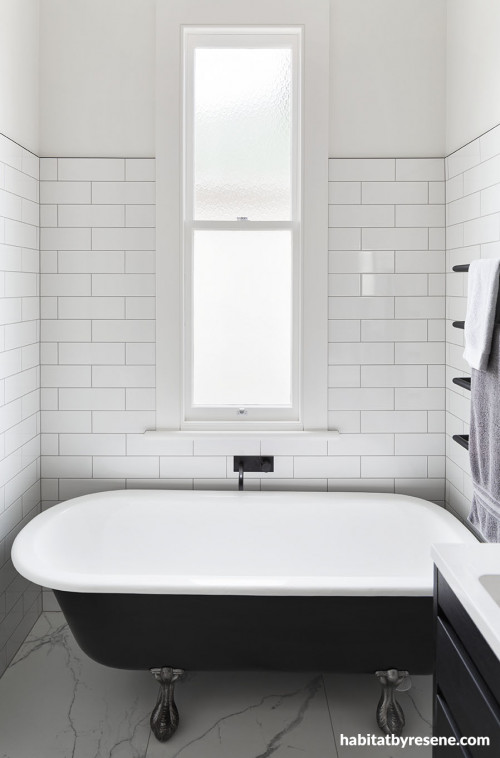 The soft, natural colour palette meanders gently through the house and comes to a striking halt in the bathroom, where Resene Half Merino walls are juxtaposed against deep black cabinetry and the original clawfoot bath, refurbished painted with Resene Nero on the outside. “I’m really happy with the bathroom,” says Peter. “It’s a challenging space being long and narrow, but by changing the layout we have created a useful and beautiful bathroom that also includes great functionality.”