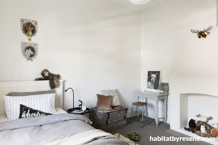 The couple take inspiration from the work of American designer Joanne Gaines, whose philosophy on clean colour palettes and recycled vintage pieces have informed the décor choices in their home. Debbie especially enjoyed renovating the children’s bedroom, where she continued the colour scheme with Resene Half Merino walls, ceiling and trim. “My favourite room is the front children’s bedroom, which I had fun dressing,” she says. “There is an original brick fireplace which we rendered then painted Resene Half Merino.