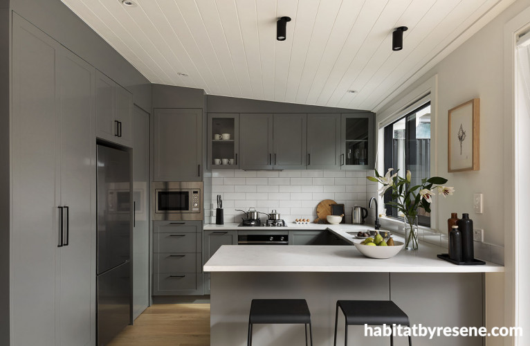 The couple went bold in the kitchen with Resene Double Stack on the cabinetry to complement the walls in Resene Half Merino.