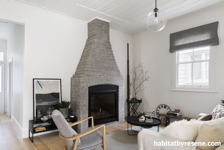 One of the challenges the couple faced working with an older house was balancing the desire to create a beautiful space with the mechanics of creating an efficient home that was warm and dry. Alongside fully insulating the house, Peter and Debbie refurbished the beautiful fireplace, scraping back the mortar and skimming the brickwork with Rockcote fine sponge plaster from Resene Construction Systems, before removing the old firebricks to install their new Escea gas fire. “The fireplace was a hidden treasure covered by the original framing, scrim and lining,” says Peter. “Once we had exposed the original brickwork we decided to make it a feature in the house.