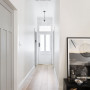 The natural wooden flooring of the hallway pairs beautifully with walls, ceiling and trim in Resene Half Merino. Resene Foggy Grey adds a pop of elegance on the bungalow doors.