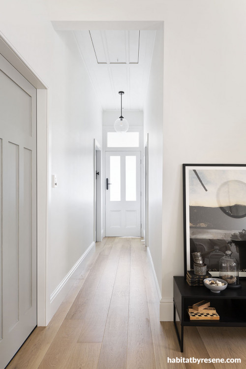 The cottage itself embodies simplicity; its square-fronted design is one of four identical builds on the street. With a floorplan of just 95m2, including a kitchen extension completed in the 1990s, the couple worked with colours that would make the home feel bigger – inside and out. They painted the exterior Resene Black White and finished the look with a bold Resene Nero front door and Resene Gunsmoke on the veranda floor. “There is a real honesty about this house,” says Peter. “The overall look we wanted was to combine the original character of the house with comfortable modern living.