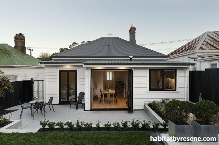 The kitchen and dining room look out onto Peter and Debbie’s manicured back garden. The cottage’s exterior walls are in Resene Sonyx 101 Black White with Resene Lustacryl Black White trim.