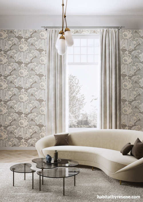 This modern and sophisticated room pairs a neutral, floral wallpaper, Resene Wallpaper Collection AGA301, with light washed flooring and creamy tones – a great choice if you love florals but want to stick to a neutral palette.