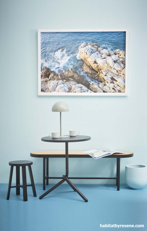 This seaside room features walls and plant pot in Resene Reservoir and floor in Resene Hippie Blue. Bench from Good Form, lamp and cups from Città. Project by Amber Armitage. Image by Wendy Fenwick.