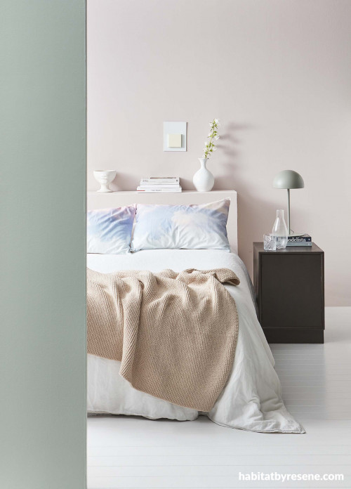 Calming and charming, the back wall of this bedroom is in Resene Soothe, left wall in Resene Peppermint, floor in Resene Hint Of Grey, side table in Resene Blackout and vase in Resene Hint Of Grey. Duvet cover, throw and lamp from Città, pillowcases and ceramic vase from Republic Home. Project by Amber Armitage. Image by Wendy Fenwick.