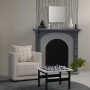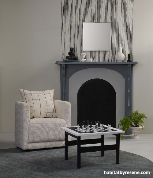 This sophisticated living space features walls in Resene Triple Merino with hand-painted pinstripes in Resene Double Cod Grey, floor in Resene Kensington Grey, mantle in Resene Raven, arch in Resene Double Cod Grey and chessboard table and vases in Resene Double Cod Grey and Resene Seashell. Chair from King, rug from The Ivy House, cushion from Città. Project by Kate Alexander. Image by Bryce Carleton.