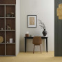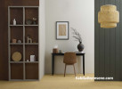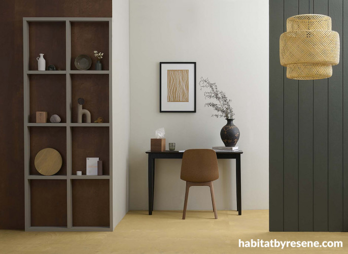 The back wall of this simple, earthy office is in Resene Triple Merino, timber wall (left) stained in Resene Colorwood Pickled Bean, grooved wall (right) in Resene Quarter Karaka, shelves in Resene Settlement, floor stained in Resene Colorwood Uluru and desk in Resene All Black. Artwork from endemic world. Project by Kate Alexander. Image by Bryce Carleton.