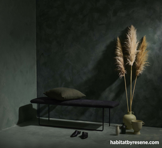 The right wall of this relaxing green nook is in Resene Mangrove with Resene FX Paint Effects medium coloured with Resene Ravine, left wall in Resene Ravine with Resene FX Paint Effects medium coloured with Resene Mangrove, floor in Resene Pumice with Resene FX Paint Effects medium coloured with Resene Ravine, large vase in Resene Nirvana, plant pot in Resene Miso and small vases in Resene Travertine and Resene Possessed. Bench and cushion from Bauhaus. Project by Laura Lynn Johnston. Image by Bryce Carleton.