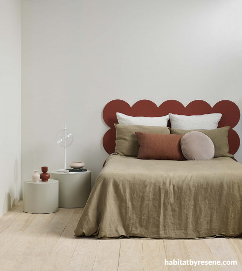 The walls of this neutral haven are in Resene Eighth Tana, circle headboard in Resene Prairie Sand, floor in Resene Colorwood Whitewash, side tables in Resene Tana and vases and accessories in Resene Prairie Sand and Resene Pearl Bush. Lamp, bedlinen and cushions from Città. Project by Laura Lynn Johnston. Image by Bryce Carleton.
