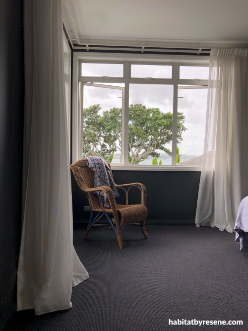 Nicky chose Resene Fuscous Grey for the master bedroom to frame the view and change the feeling of the room. "The dark grey gives, what could be an overly bright bedroom, a moody and encapsulating feeling,” says Nicky.