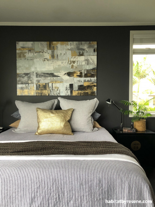 Resene Fuscous Grey in the master bedroom makes a striking backdrop for Nicky’s art collection. The trims and ceiling are Resene Eighth Friar Grey.