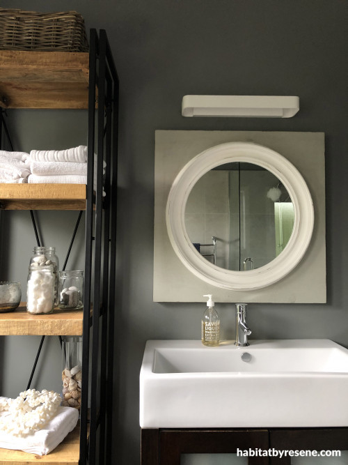 Resene Gunsmoke gives the downstairs bathroom a simple elegance.
