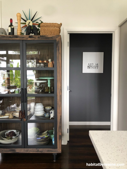 The hallway, seen here from the kitchen, is painted in Resene Half Fuscous Grey. The kitchen wall colour is Resene Milk White, the door frame and trims are Resene Half Milk White.