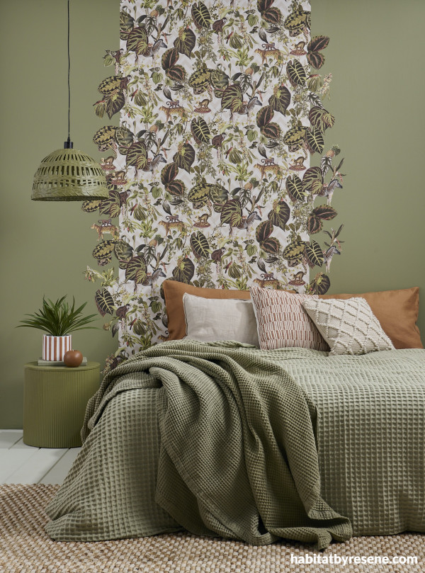 In this nature inspired room, the wall is painted in Resene Bitter, floor in Resene Moon Mist, feature in Resene Wallpaper Collection 37990-3, bedside table and rattan pendant in Resene Hemlock andtealight holder in Resene Cape Palliser. Rug from Mocka, duvet set from Bed Bath & Beyond, linen cushion cover and throw from H&M Home, plant pot from Home Republic.Project by Vanessa Nouwens, image by Bryce Carleton.
