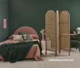 The pink tones, arches and rounded shapes in this multifunctional space make it feel cohesive. Wall painted in Resene Forest Green, arch headboard and reading area side table in Resene Coral Tree. The edge of the Mocka rattan screen is painted in Resene Summer Rose, flooring in Resene Colorwood Breathe Easy, bedside table in Resene Meringue and DIY artwork, vases and other accessories in Resene Coral Tree and Resene Meringue. Bedlinen from Adairs, throw from H&M Home, cushions from Mocka, Adairs and H&M Home. Project by Vanessa Nouwens, image by Bryce Carleton.