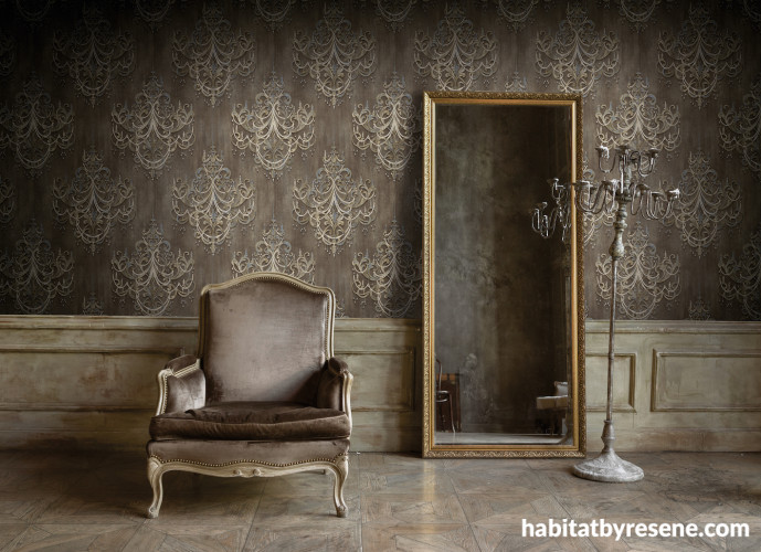 The matured look of Resene Wallpaper Collection 38096-1 gives the sense of rich history, perfect for a royal themed room. Add velvet fabric and gilded mirrors to top off the grandeur look.