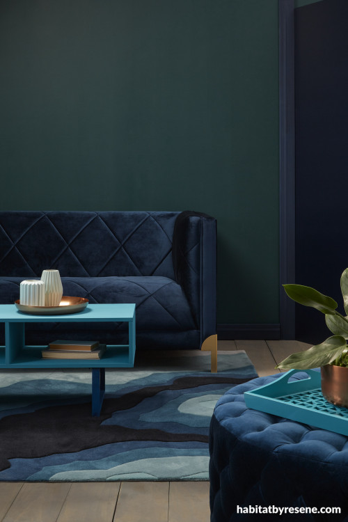 Crisp turquoise touches in Resene Yowza on the tray and Resene She’ll Be Right painted on the coffee tabletop give this grand colour scheme a fresh and modern touch. The walls are painted in Resene Atlas with architraves in Resene Indian Ink, floor in Resene Colorwood Mid Greywash, coffee table legs in Resene Wishing Well and vases on the table in Resene Cleopatra. Sofa and ottoman from Contempa, copper vessels from Freedom, rug from Designer Rugs. Project by Megan Harrison-Turner, image by Bryce Carleton.
