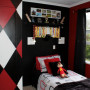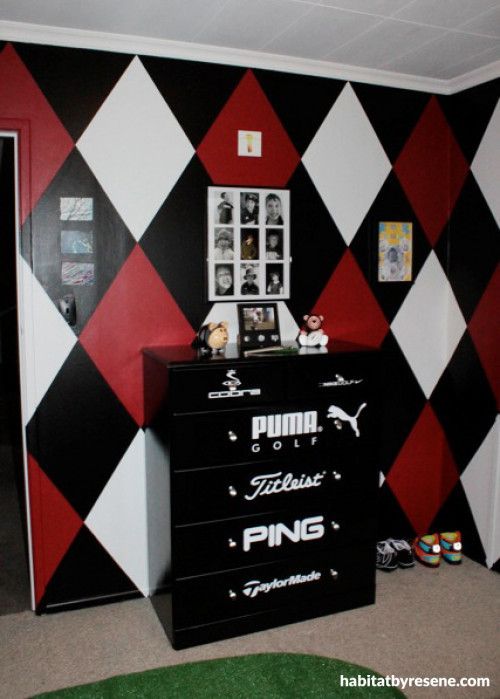 The bedroom is based on a golf theme due to Dillin’s love of the game, with a putting green carpet and drawers decorated with popular sport sponsors’ logos. The colours are Resene Hot Chile (red), Resene Black and Resene Half Sea Fog.