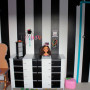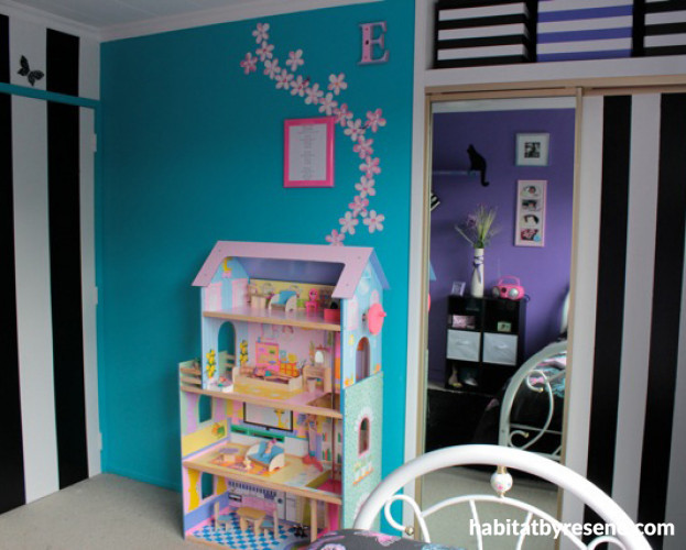 I decided to give Ellex a room that will work for her at this young age, and for when she becomes a tween. I love black and white and pinstripes, so decided to paint her a pinstripe feature wall with drawers painted in the same effect. To add some colour, Ellex picked out purple for one of the walls (painted in Resene Studio) and a Resene colour consultant helped me choose the blue, Resene Pelorous – they look awesome together.