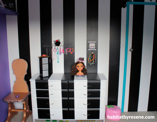 Carrie loves black and white, so painted pinstripes in Resene Black and Resene Half Sea Fog for the feature wall and drawers in daughter Ellex’s bedroom.