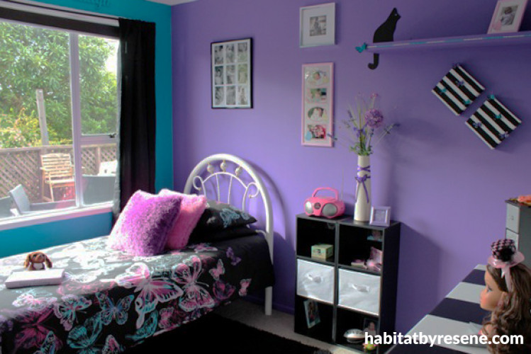 While Ellex likes all colours, she’s a ‘girly-girl’ at heart and loves purple. Her bedhead wall is painted with Resene Studio (purple) and remaining walls in Resene Pelorous (blue).