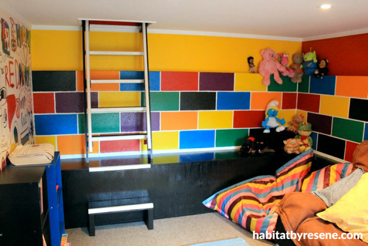 A trapdoor ladder from Dillin’s bedroom wardrobe shoots into the kids’ playroom, where colourful brickwork and fun toys await. The upper part of the wall is painted in Resene Lightning Yellow, and bench is in black Resene Nero. The coloured ‘bricks’ are in a variety of Resene testpots.