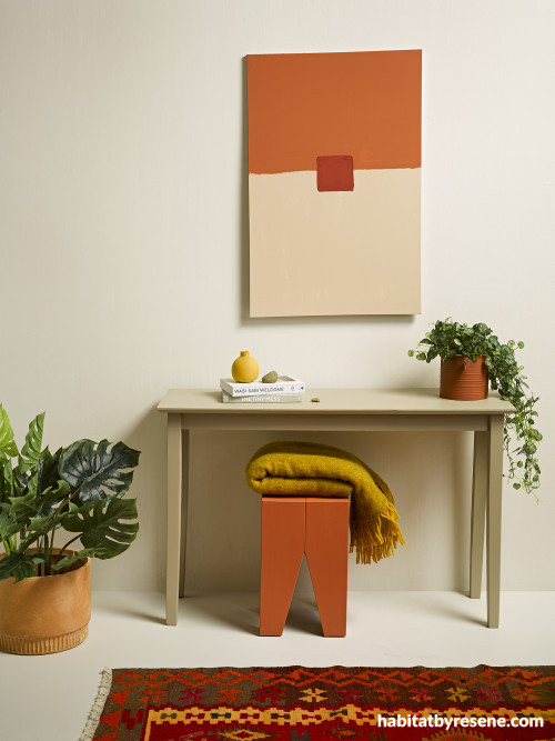This room leans into the spicy shade trend via fun accessories and furnishings that pop. Wall in Resene Alabaster, floor in Resene White Pointer, small vase in Resene Cleopatra, plant pot in Resene Moccasin, table in Resene Double Bison Hide, DIY artwork in Resene Sunbaked, Resene Shabby Chic and Resene Raging Bull and peg stool in Resene Sunbaked.