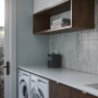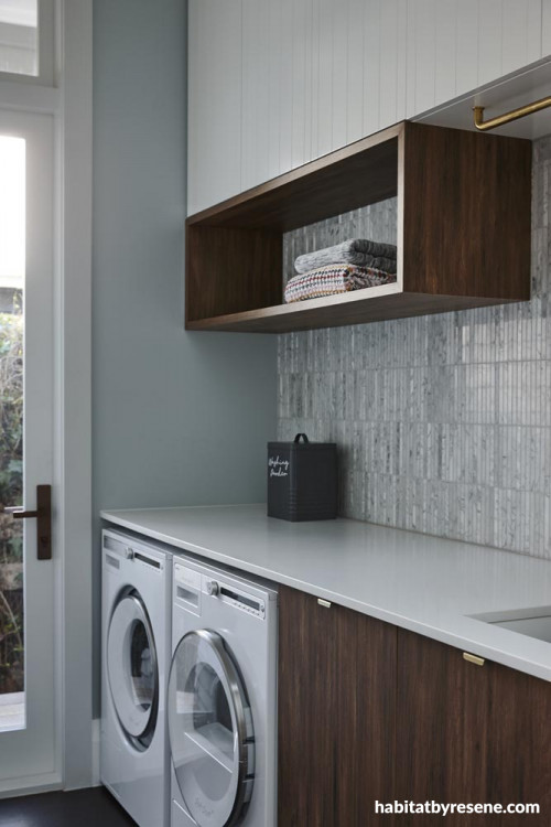 “For the laundry room we wanted to create a light, calm space. We chose Resene Duck Egg Blue for its pale, reflective and delicate nature. It was a great pairing for the marble finger tiles and walnut cabinetry. Resene Quarter Rice Cake was used on the above bench cabinets and ceiling to bounce light around the room and onto the ceiling.”