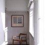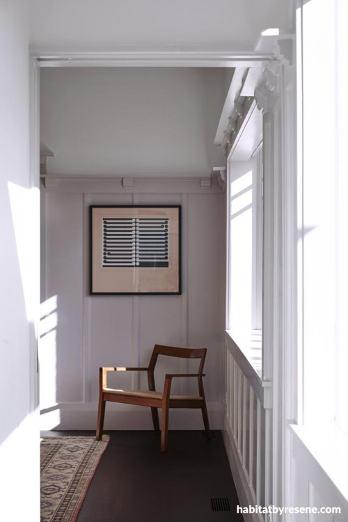 “For the hallway we wanted a bright, reflective gallery-like space that worked with the blues, and neutrals in the other rooms. We used Resene Quarter Rice Cake on the walls, ceiling, trims and skirting board to create a warm yet bright space that let their art stand out,” says interior designer Clare.