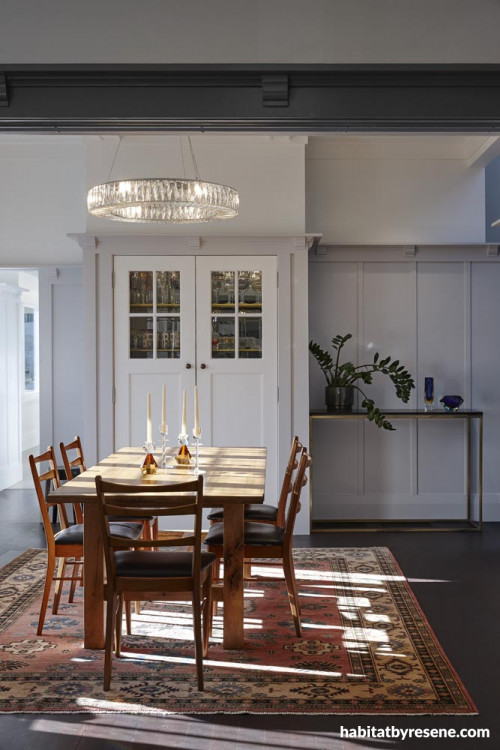 In the dining room, Clare says she wanted to create a space that reflected the western light for afternoon and evening drinks and shared meals. “We chose to paint the panelling in Resene Rakaia for its cool shale grey shade that bounced light around the room.”