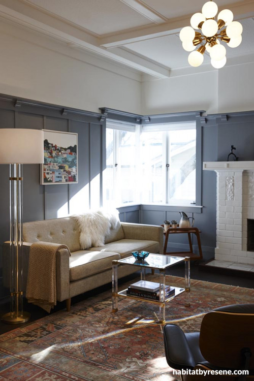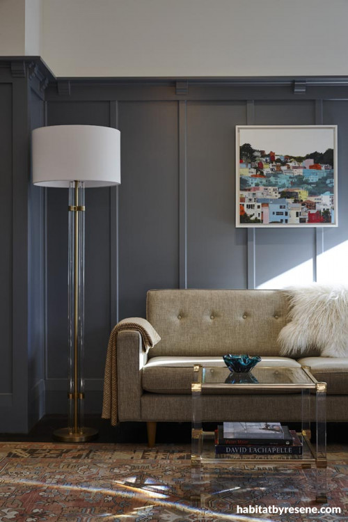 They chose to paint the panelling in Resene Rakaia for its cool shale grey shade that bounced light around the room. Resene Quarter Rice Cake is painted on the ceiling and the walls above the panelling to link the room back through to the hallway.