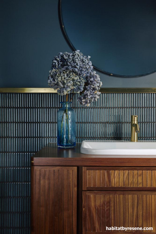 “For the powder room we wanted to create a dark, moody and elegant vibe. We chose Resene Fast Forward as it’s a deep slate blue with undertones of green. This colour worked perfectly with the glossy peacock coloured finger tiles that we used up to the dado line and set the perfect backdrop for the brushed brass tapware and shelf.”