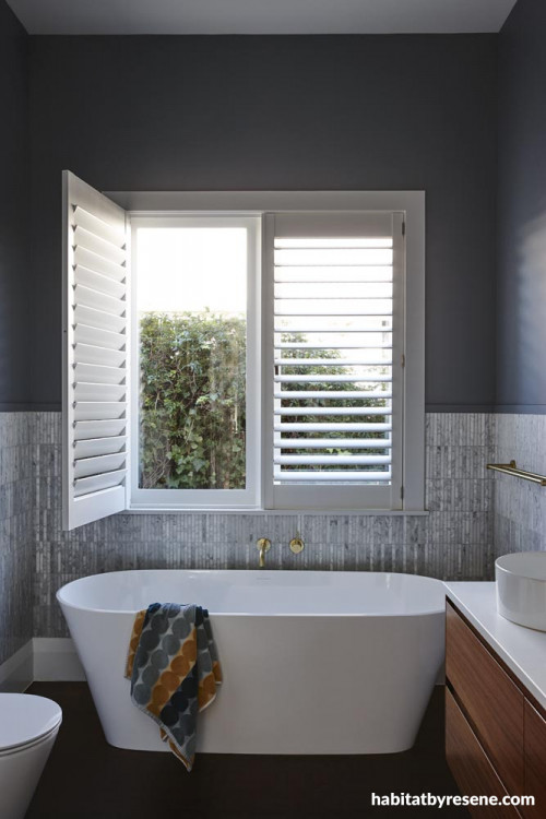 “For the kids’ bathroom we wanted to create a space they wouldn’t grow out of. We chose Resene Raven for its timeless grey-blue which coordinated well with the marble finger tiles.”